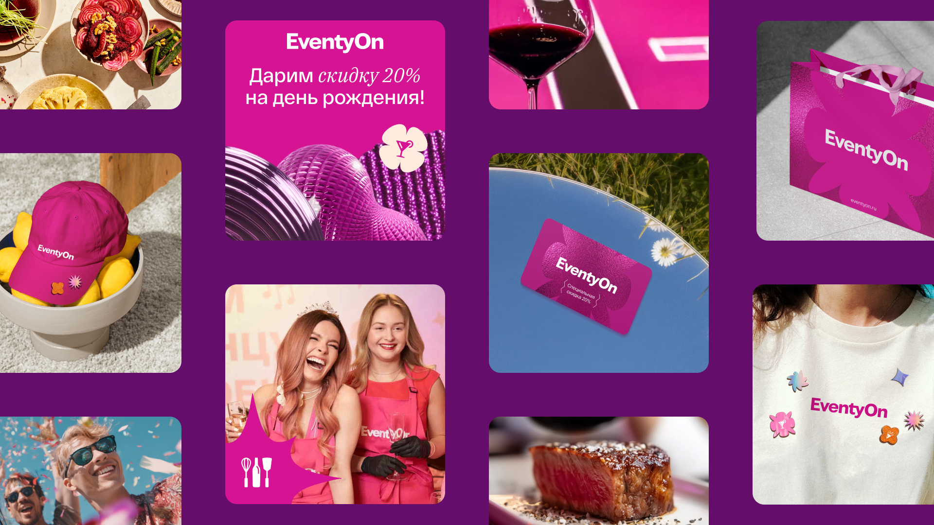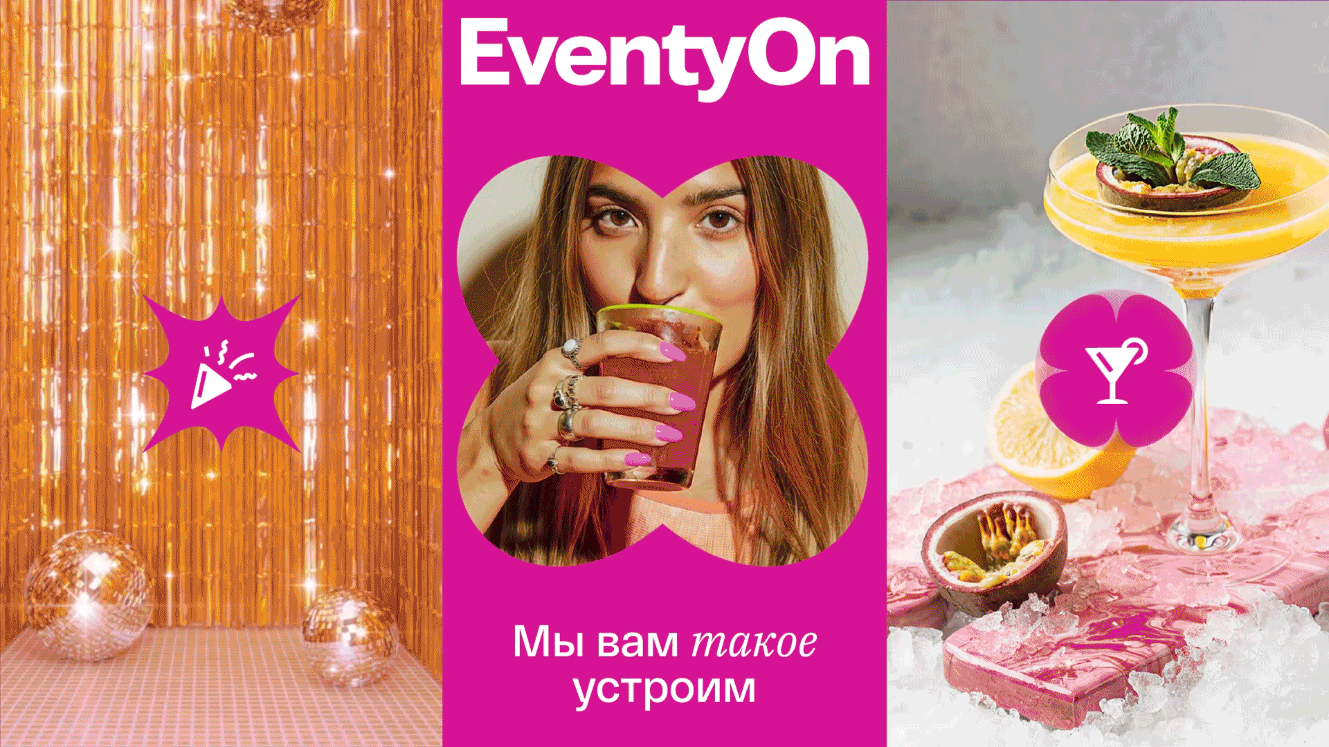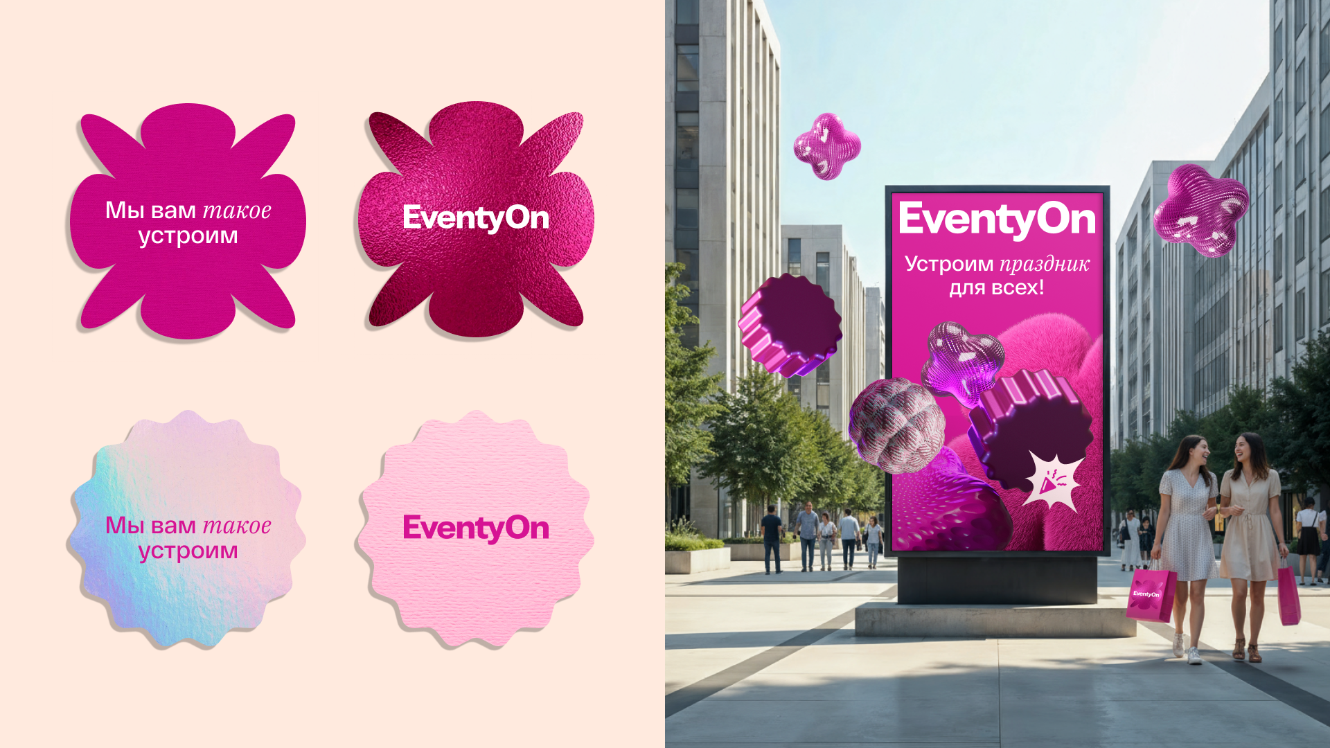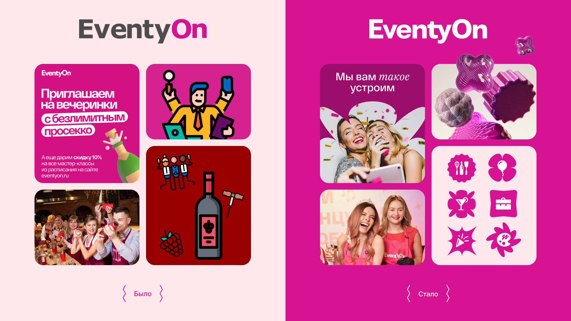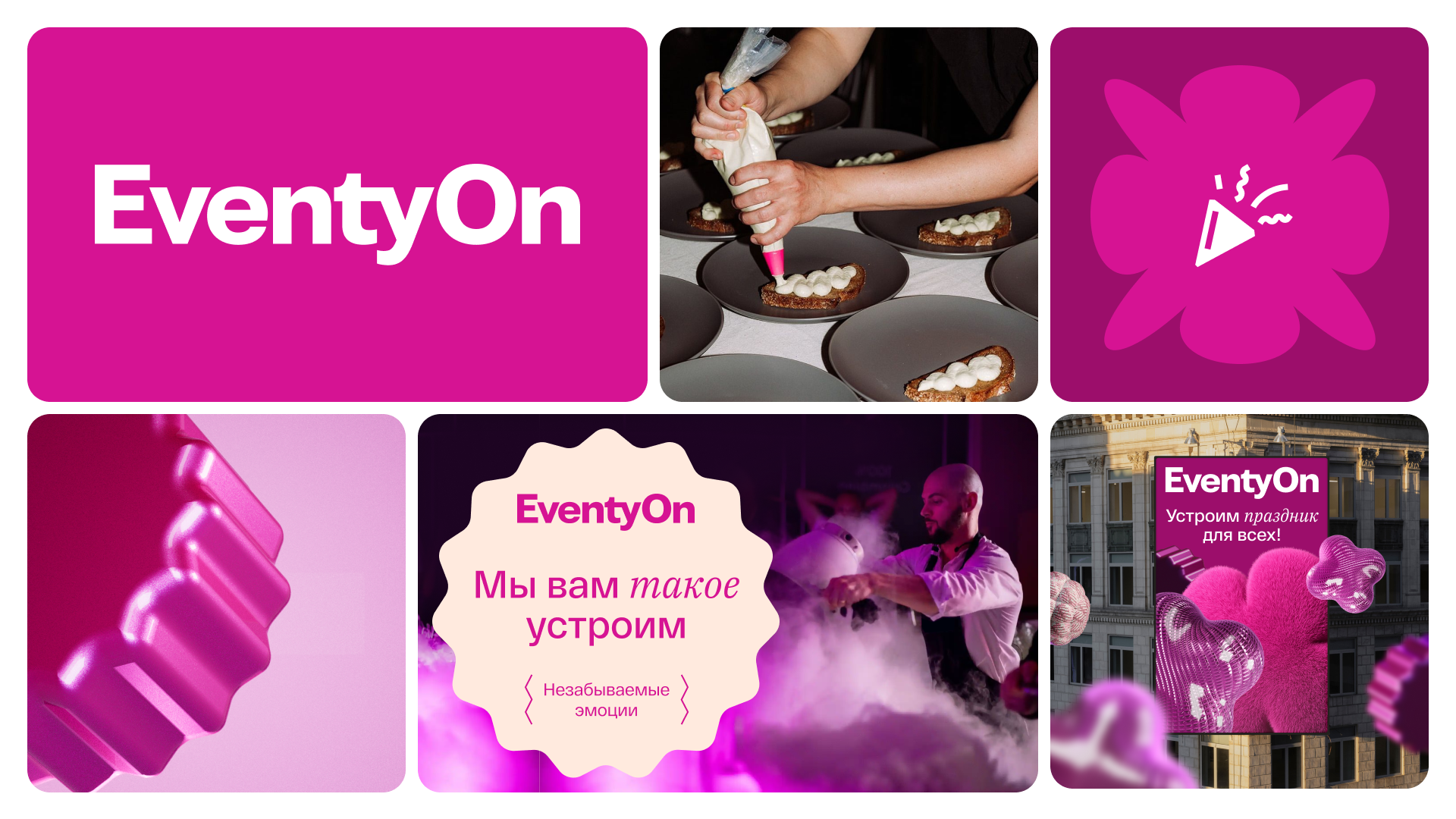«Неожиданное, яркое, запоминающееся» – слова, которые описывают ощущения, что остаются в сердцах людей после мероприятий, которые организовали в EventyOn. Эти слова стали основой для ключевой идеи бренда – «с нами сердце будет биться чаще от новых впечатлений, и теплых воспоминаний». Чтобы передать предвкушение праздника и позитивных эмоций, был разработан слоган «Мы вам такое устроим».