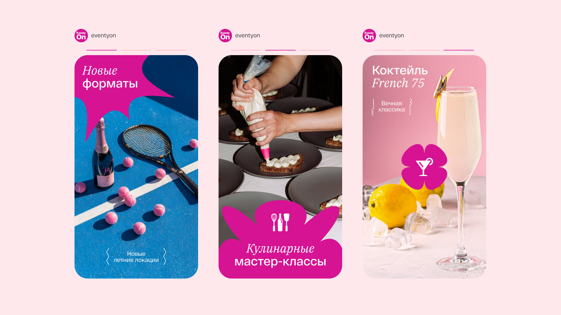Обновление с точки зрения коммуникации и айдентики должно было дать аудитории понимание, что компания работает в премиум-сегменте и имеет широкий спектр предложений для организации мероприятий. Также следовало учитывать насыщенную конкурентную среду, на фоне которой важно было выделить EventyOn.